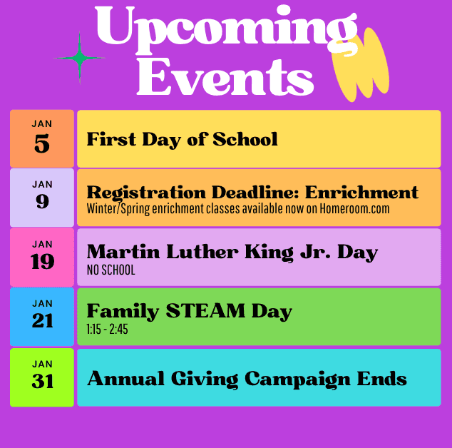 It's time to sign up for new enrichment classes! We have so many great programs such as art, music, dance, yoga, sports, biking, capoeira, gymnastics, drama, chess and more! Registration is open now and goes through January 9th. To view the schedule and choices go to Homeroom.com. Everything is listed on Homeroom except for Mandarin and Spanish.